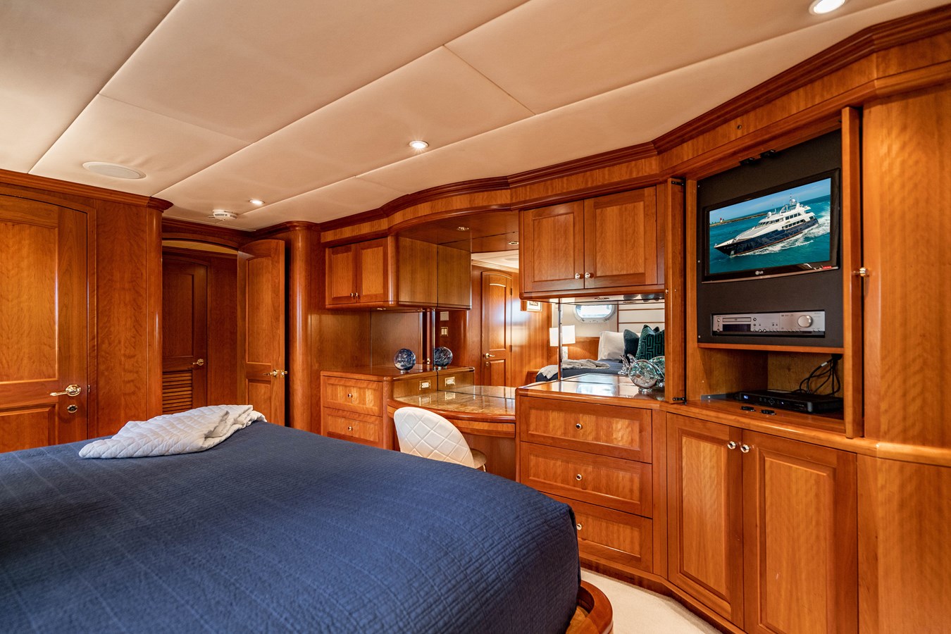 The full-beam master stateroom is located on the main deck and features a king-size bed and en-suite bath. Below deck are two queen staterooms, a twin stateroom, and a convertible room that can function either as a guest cabin or a gym, depending on your clients' needs.