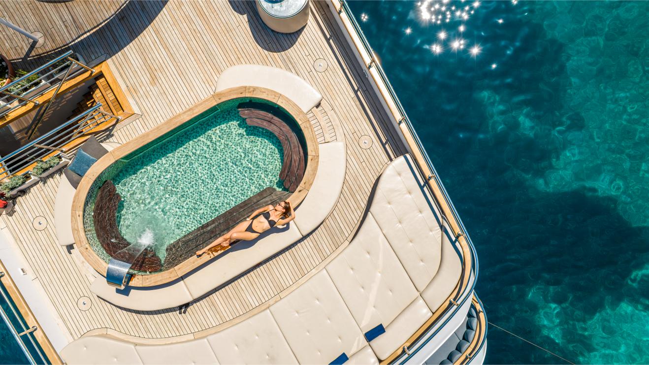 The yacht features multiple outdoor lounging spaces, a large swimming platform for easy water access, and an impressive array of water sports equipment. Her generous beam of 8.5 meters provides exceptional stability and expansive ...