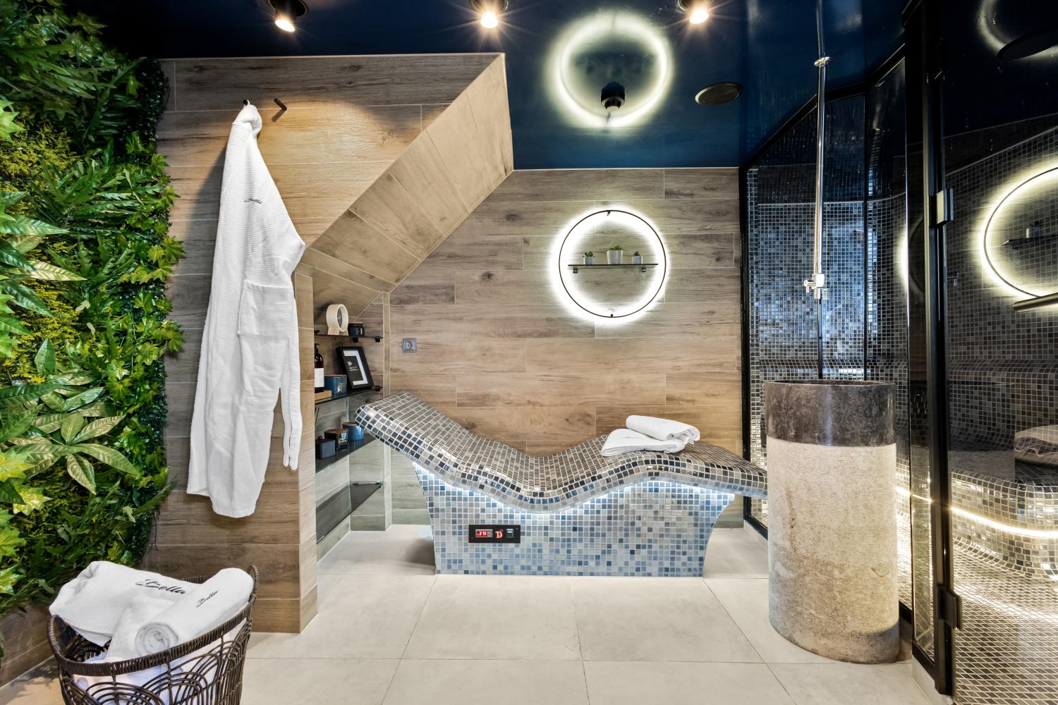 Luxurious marble-effect flooring complements the elegant furnishings, including a large dining table surrounded by premium padded chairs. Two expansive sofas offer panoramic views, while a grand piano and fully stocked bar complete this exceptional entertainment space. The salon represents one of the finest in its category.