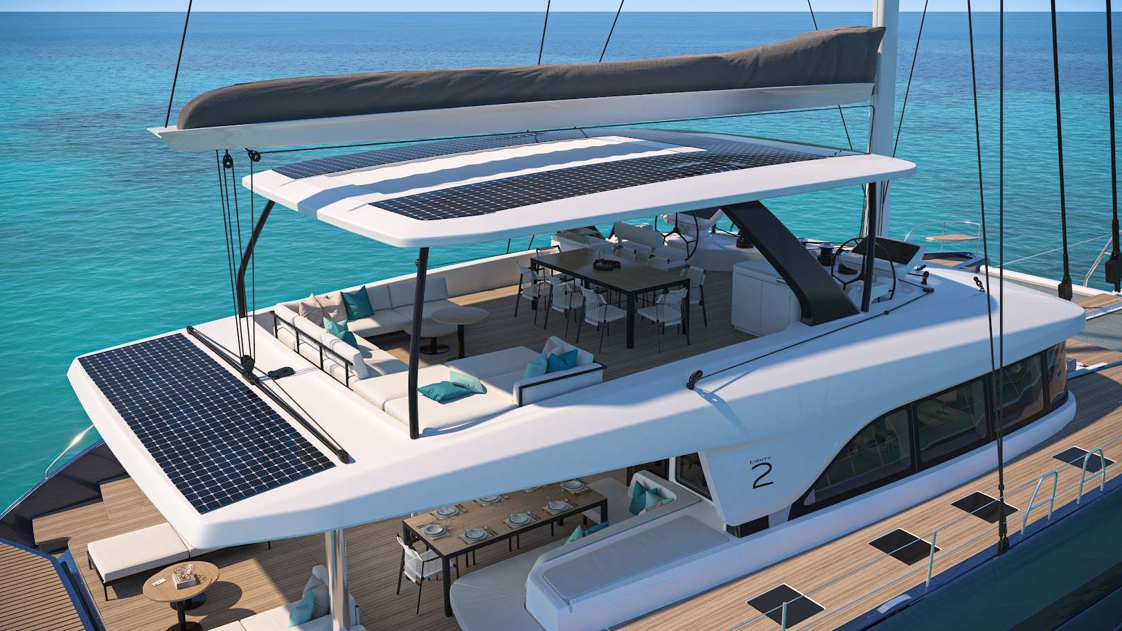 The flybridge design presents an abundance of outdoor living space with dining settings, lounge areas and sunpads across the fly and main deck.