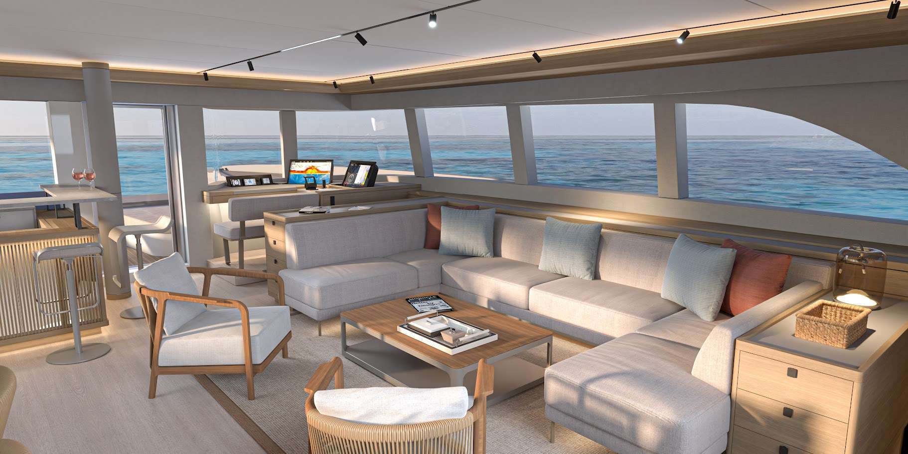 The stunning interior blends neutral soft furnishings with light wood finishes create a light and airy beach style atmosphere, perfect for holidays. The main salon is surrounded by windows which maintains a continuous connection with the outdoors and brings in lots of natural light.