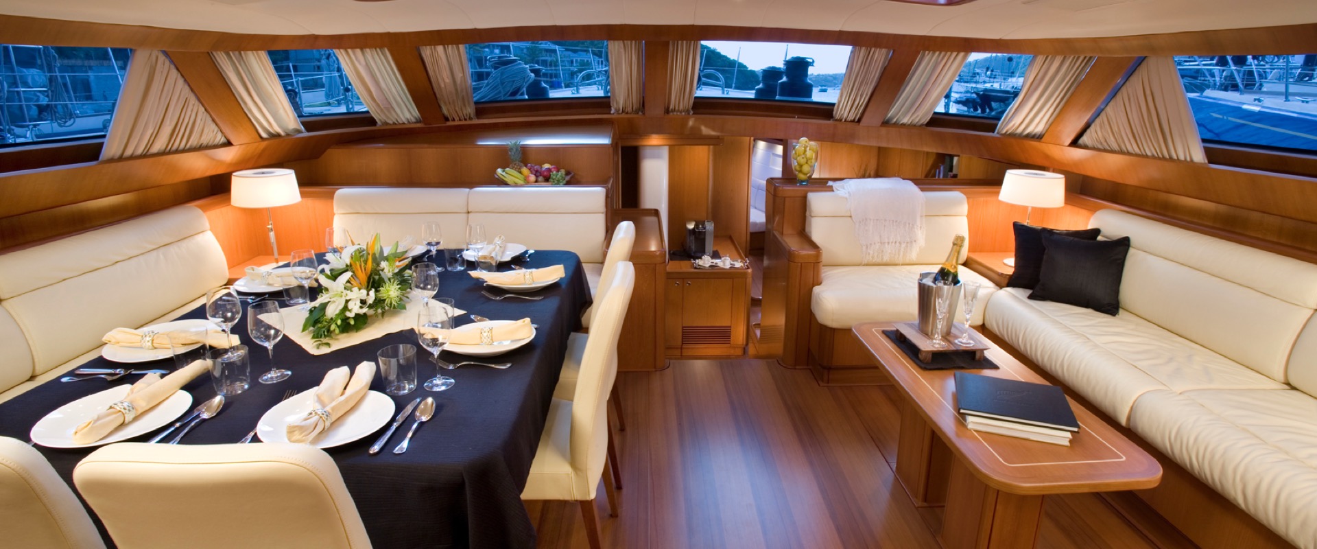 She has a voluminous saloon that includes superb visibility on 3 sides through large windows with shade blinds and sun protection and a large dining area that can fit 8 guests comfortably. There is also a bar with glassware and fridge aft to port as well as a large flat screen TV.
