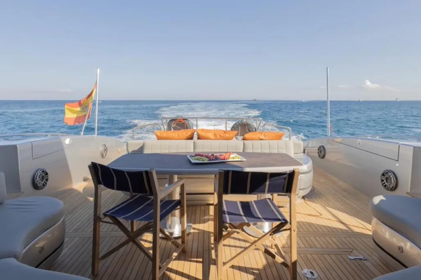 The foredeck also has built in sun pads - this time giving views over the bow - while the aft deck is set up for al fresco dining and sunbathing on aft facing sun pads. Steps lead down to the water’s edge where there is a swim ...