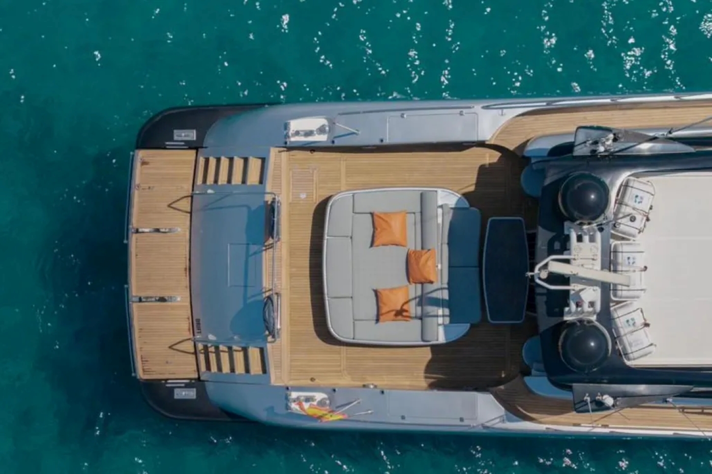 The foredeck also has built in sun pads - this time giving views over the bow - while the aft deck is set up for al fresco dining and sunbathing on aft facing sun pads. Steps lead down to the water’s edge where there is a swim ...