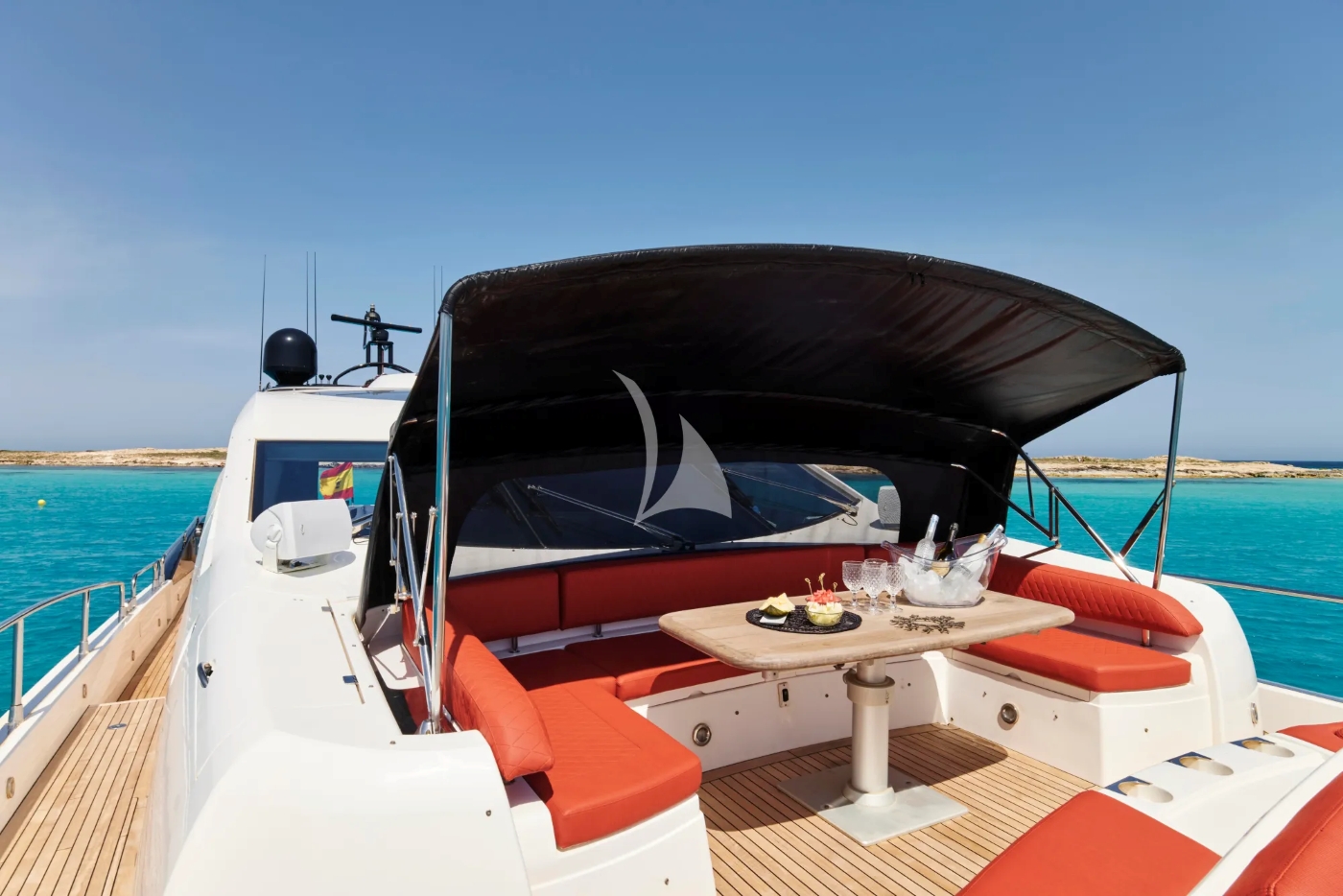 Colourful deck cushions and sunpads give the yacht a racy look which is matched by her 26-knot top speed.