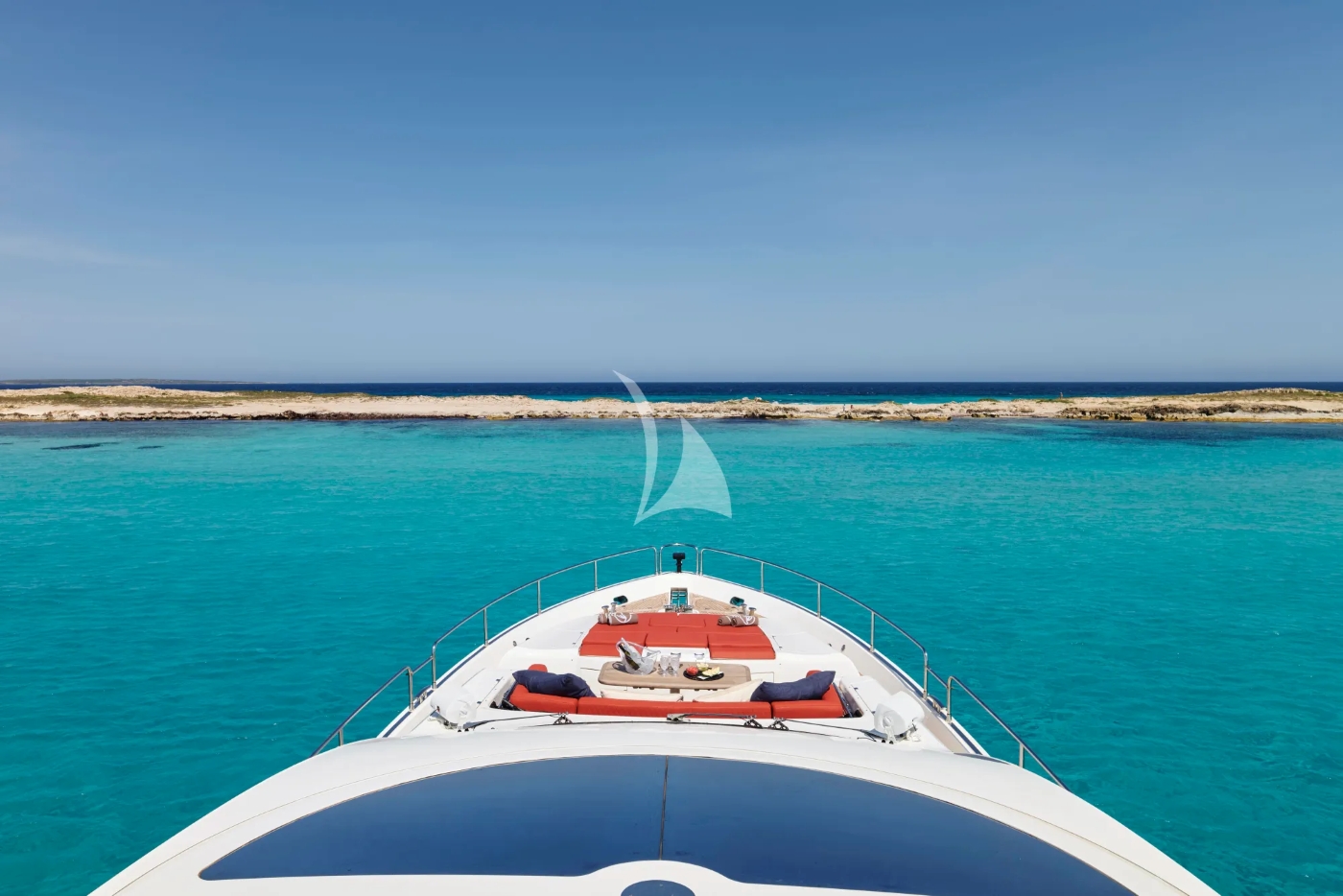 The large foredeck has a row of adjustable sun pads plus a u-shaped seating area, perfect for drinks and casual meals.