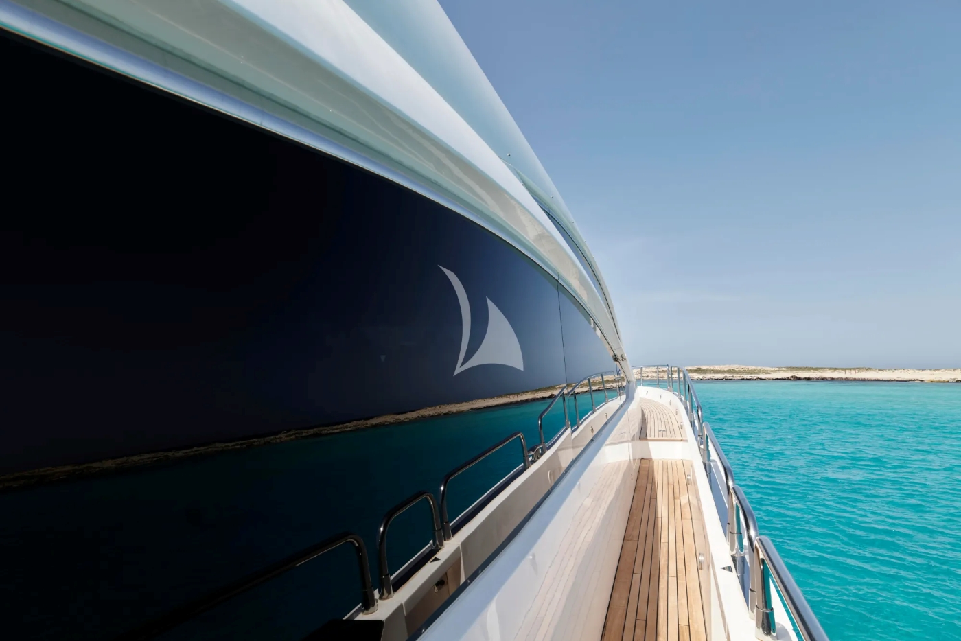 The aft deck offers direct access into the main salon and down to the water’s edge and is configured with a dining table and bench seating plus an arrangement of sun pads overlooking the stern.