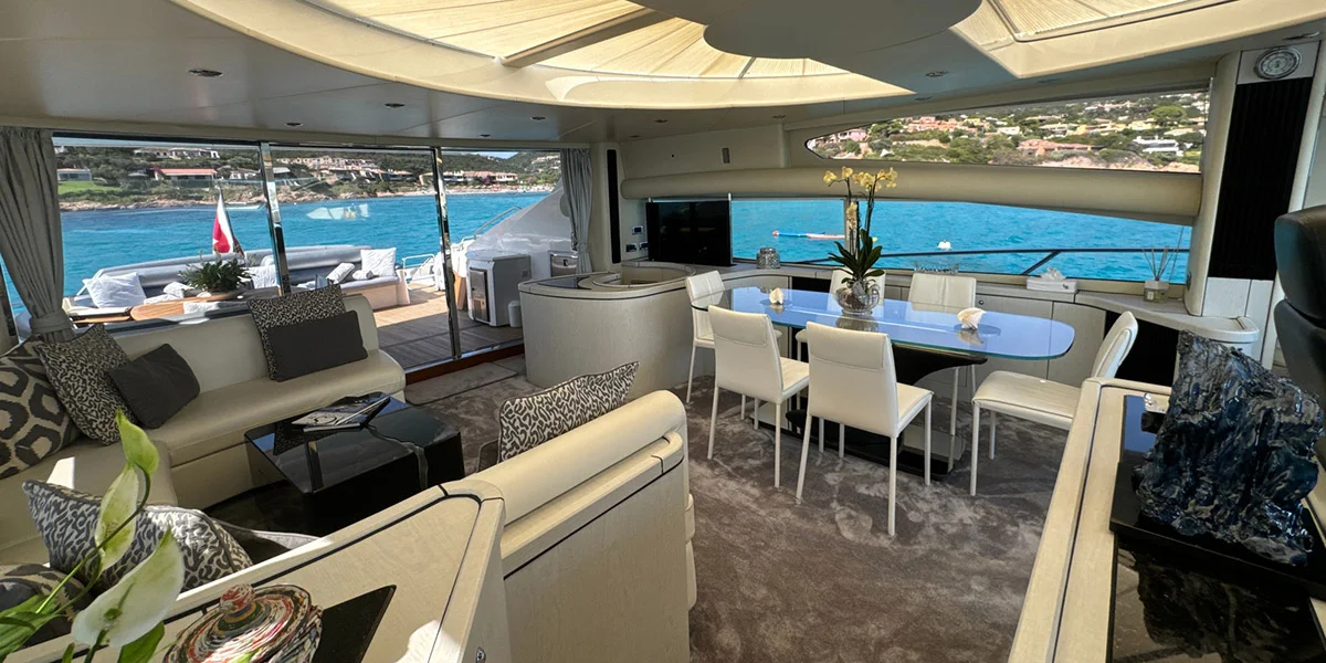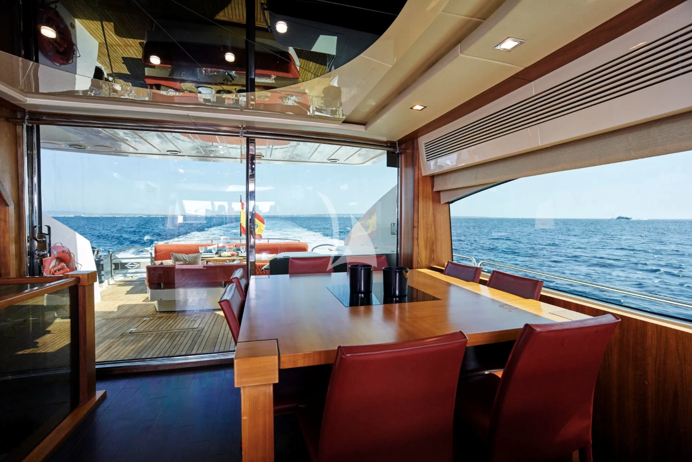 The aft deck offers direct access into the main salon and down to the water’s edge and is configured with a dining table and bench seating plus an arrangement of sun pads overlooking the stern. Guests can climb onto the roof for great views and yet more sun pads.