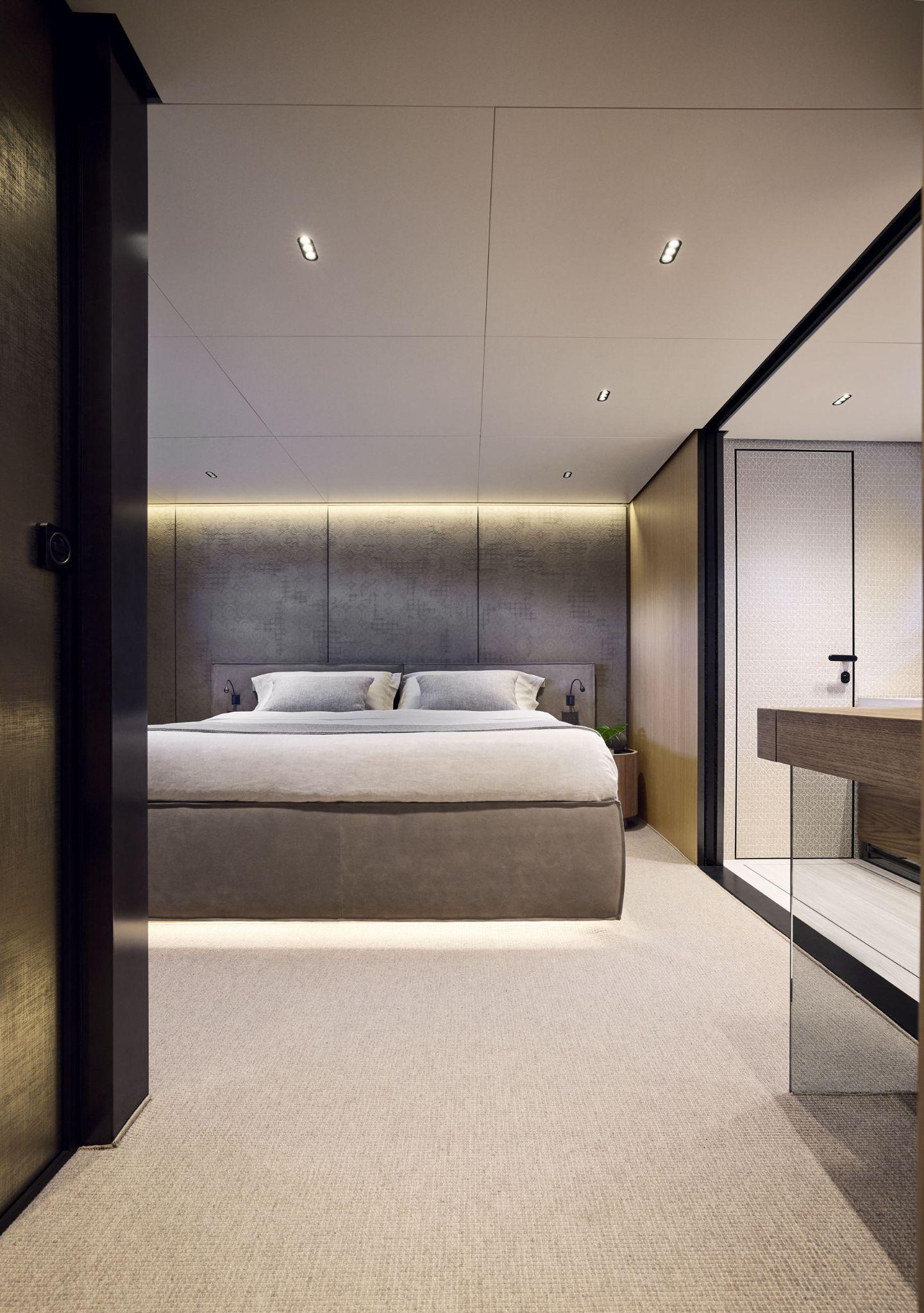 The asymmetric layout of this model maximises the yacht’s beam creating a generous main salon, filled with light from the panoramic windows.