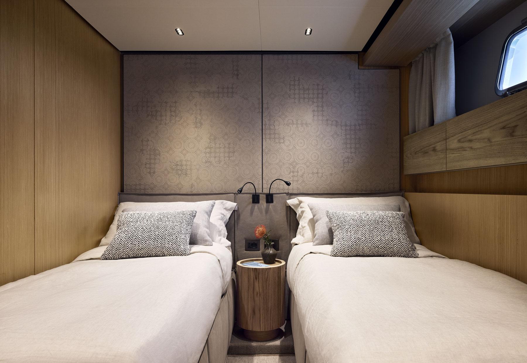 Four crew members are on board to look after charter guests while they relax across the spacious decks and spend time in the elegant interior.