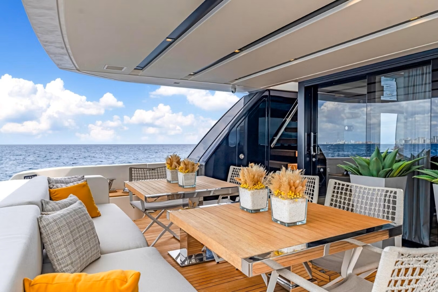This elevated space includes forward sun pads, a shaded seating and dining area, and open space aft for lounging or enjoying cocktails at sunset.