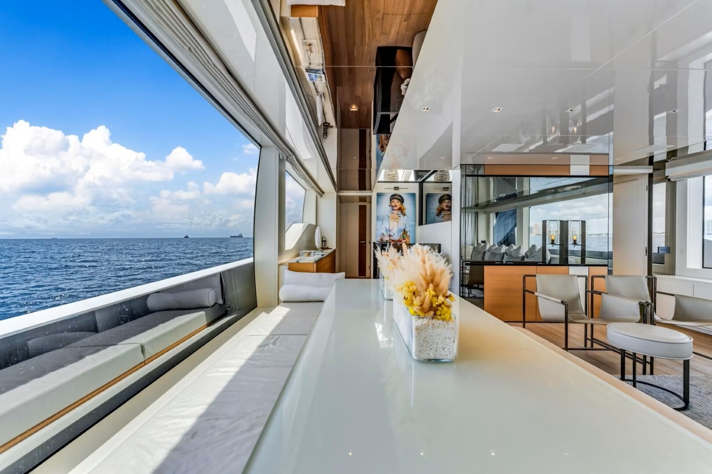 The main salon on board NOTYNOG is a luminous and welcoming space, framed by large windows that offer sweeping views and abundant natural light.