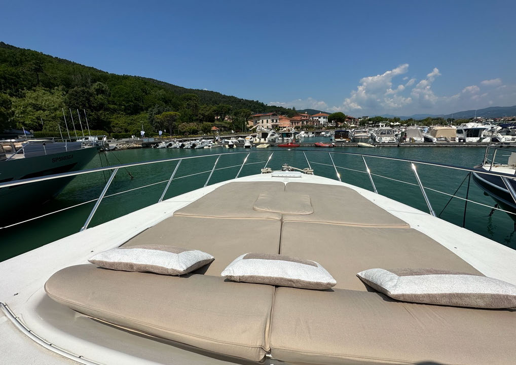 Forward, the foredeck offers another plush lounging space, ideal for quiet moments or sun-drenched afternoons.
