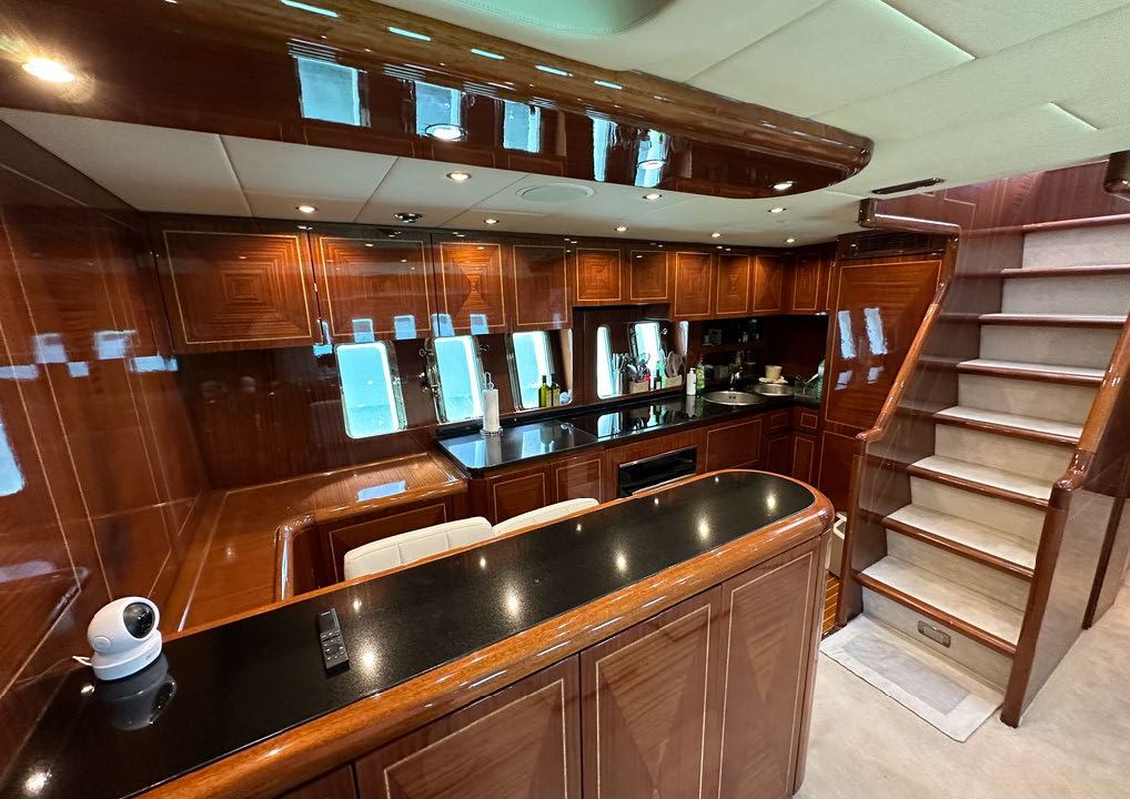 The main salon is a welcoming open-plan space with soft seating, beautiful artwork, and Hermes furnishings that elevate the atmosphere. A well-equipped galley with a breakfast bar and full-height wine cooler allows for elegant ...