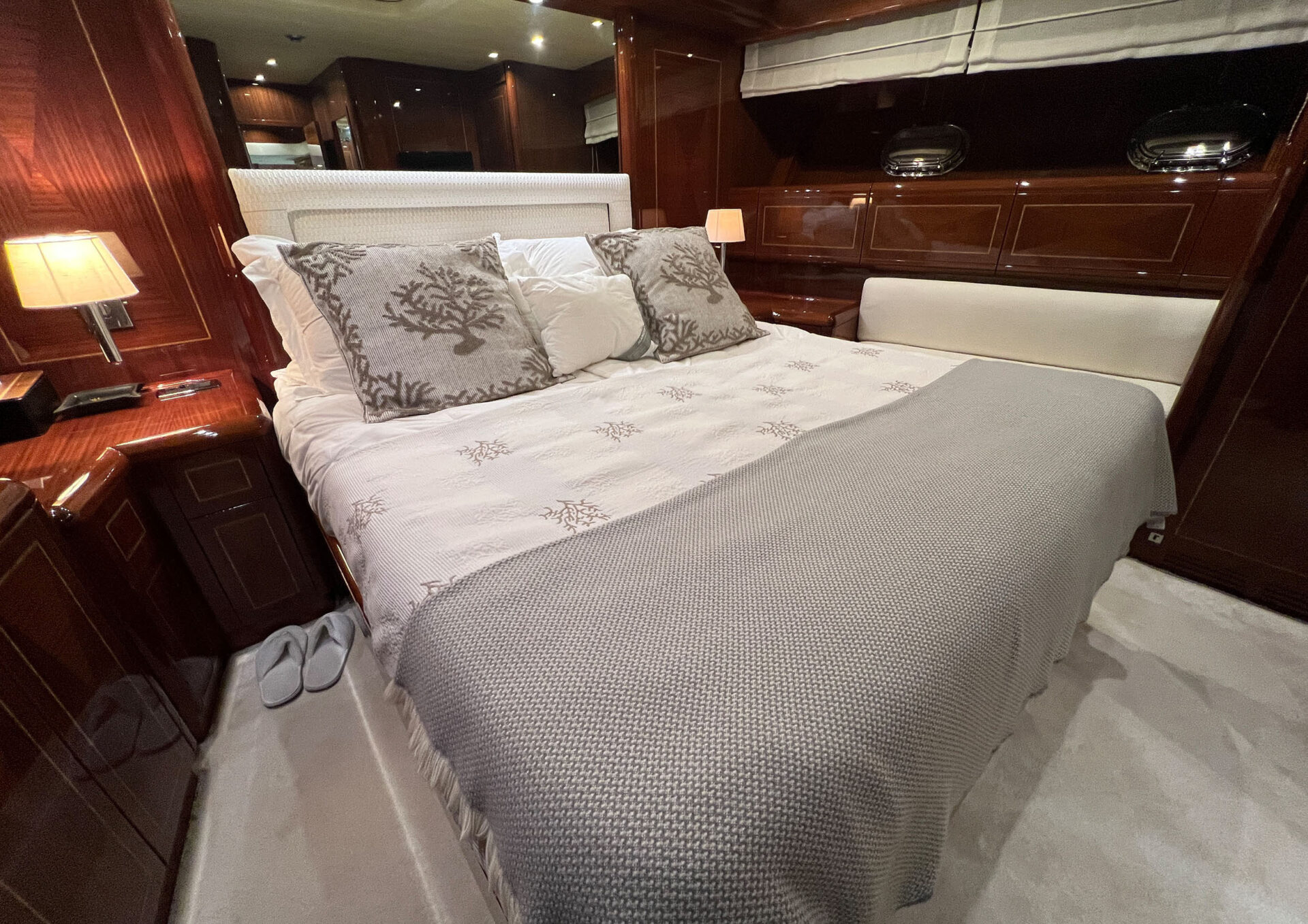 A well-equipped galley with a breakfast bar and full-height wine cooler allows for elegant onboard entertaining.