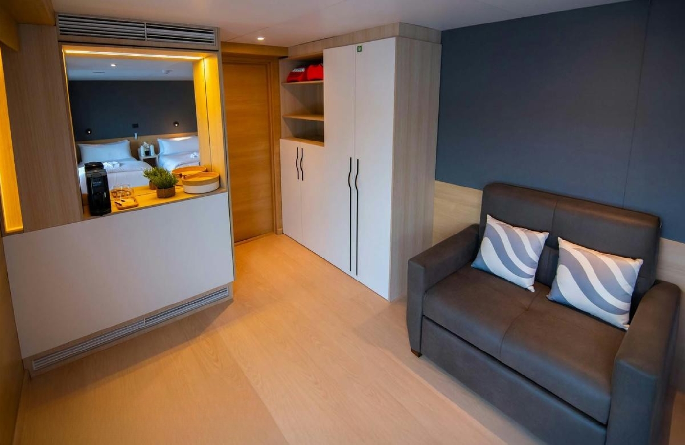One level below, the upper deck offers a dedicated massage area and workout zone complemented by an open-air sunset lounge, while the main deck features both indoor and outdoor dining zones and a bar, merging comfort with the ...