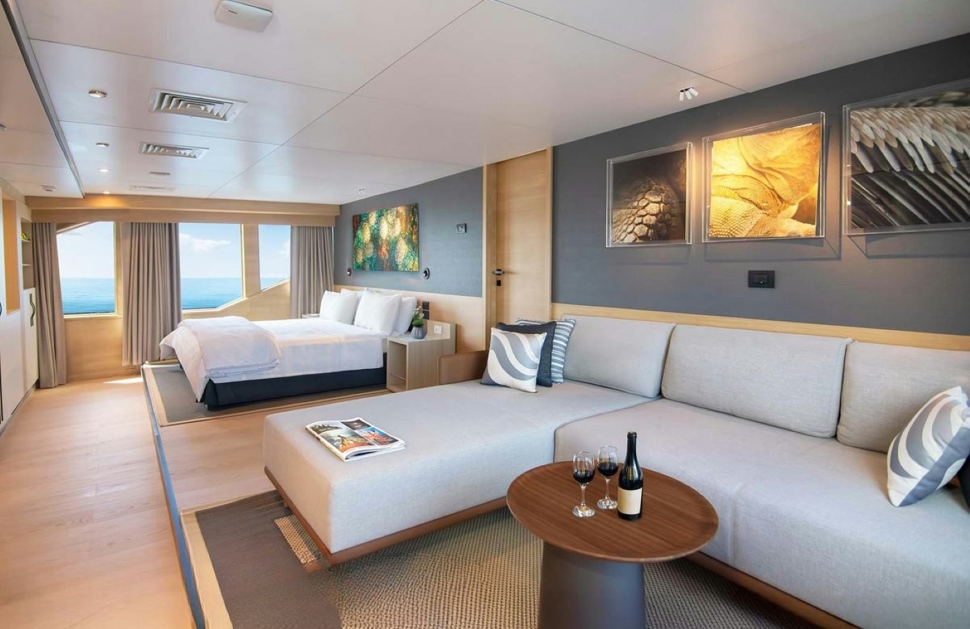 ~ Owner’s Suite: 50 m² with king ward‑robe, seating lounge, double vanity bathroom, binoculars, and panoramic views.