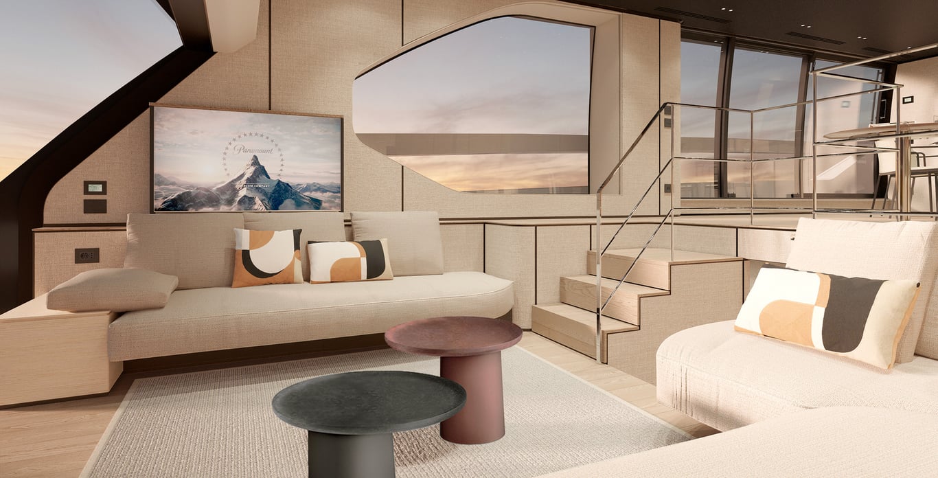 The terraced aft deck, flanked by fold down bulwarks, unfolds into a generous swim platform ideal for beach-style leisure or tender access. Above, sunpads invite you to stretch out under the sun, while the foredeck offers another chic lounge area.