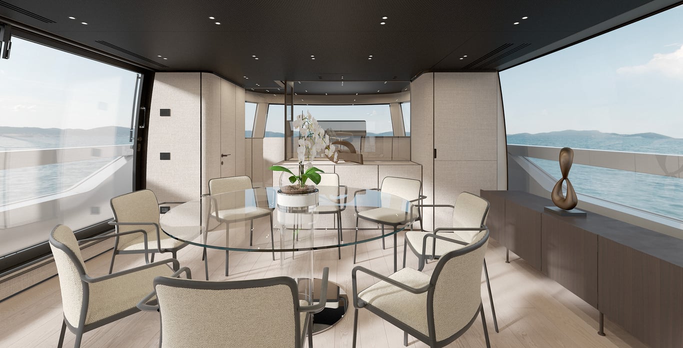 The saloon is split level with a sophisticated yet relaxed lounge on the lower level and elegant dining area on the upper level. Plush seating and a polished dining table set the mood for convivial meals, guest gatherings or quiet reading.