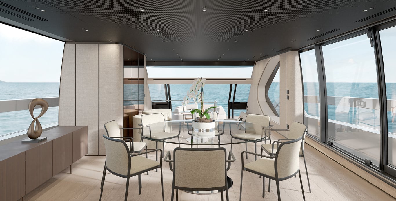 The saloon is split level with a sophisticated yet relaxed lounge on the lower level and elegant dining area on the upper level. Plush seating and a polished dining table set the mood for convivial meals, guest gatherings or quiet reading.