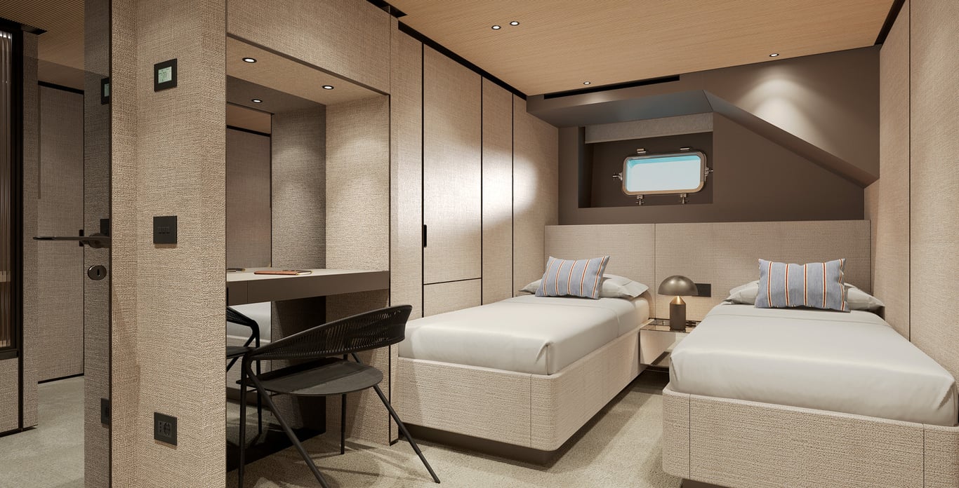 The helm merges elegantly into the space, allowing guests to be part of the navigation experience while seated comfortably within the saloon area.