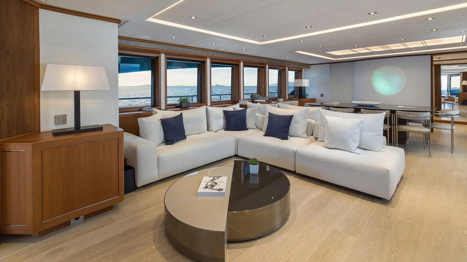 The main salon is stylishly furnished, flowing into a formal dining area for celebratory meals or elegant evenings. Large windows throughout create a bright, airy feel, while the layout has been designed for both social gatherings and private moments.