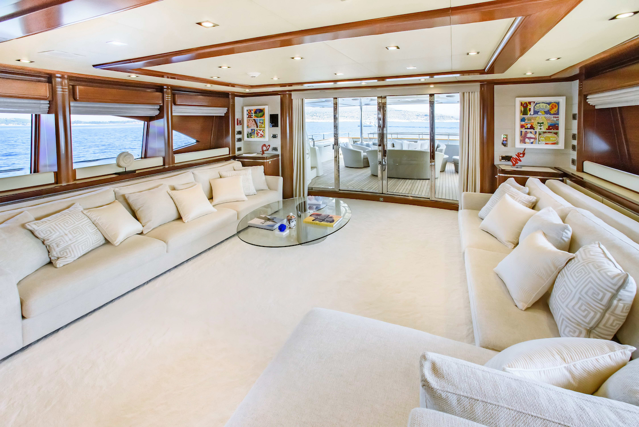 Her upper deck has a large dining table able to seat 12 guests for al fresco dining. This level also has seating lining the aft section. The large sun deck on charter yacht LIBERTAS is ideal for relaxing with its sunbeds and spa pool area.