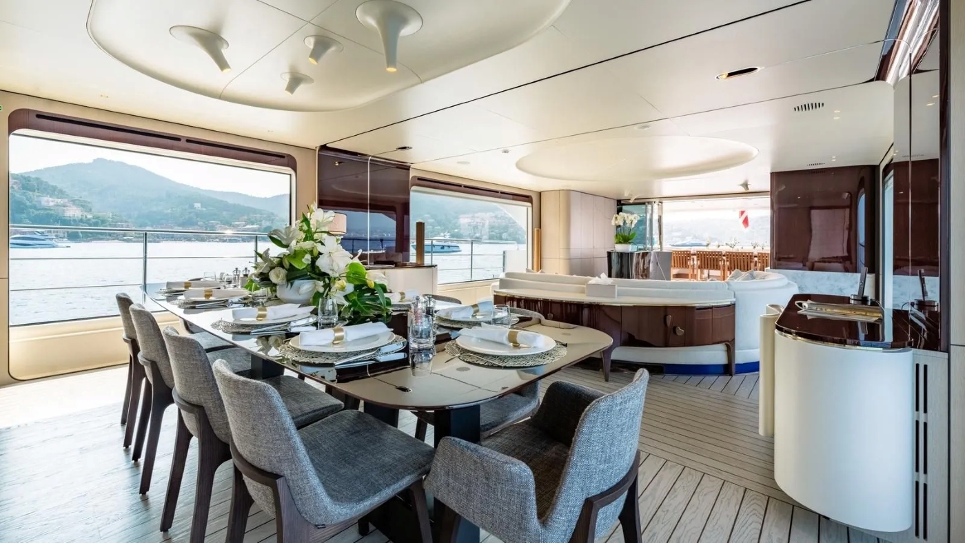 NOTABLE FEATURES OF OWO: ~Deck level Jacuzzi with dedicated lounging ~Multiple al fresco dining and lounging areas across sun and aft decks ~Outdoor cinema setup for film under the stars ~Watersports-focused toybox including 2 ...
