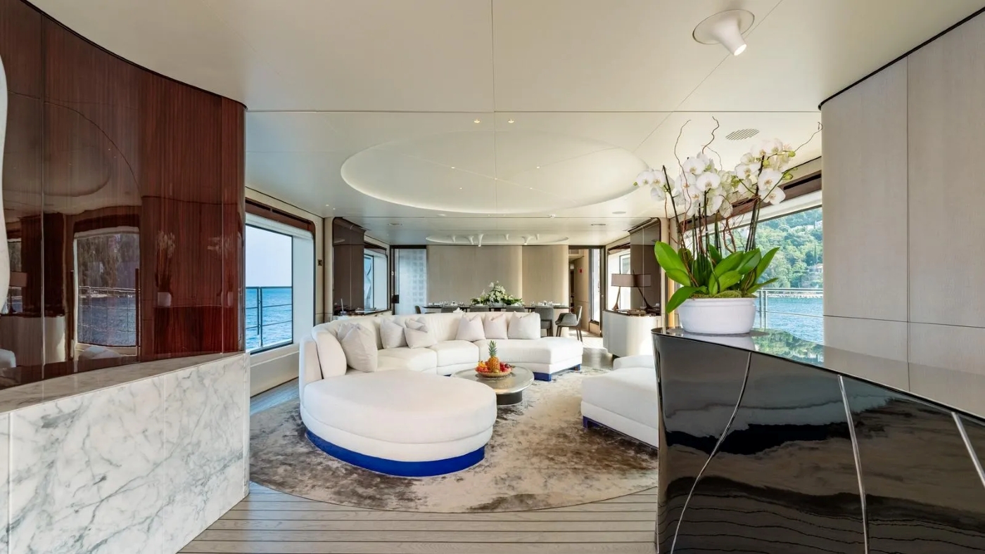 The expansive main salon is an open, bright space centred around a circular lounge area, with a wet bar and formal dining area—perfectly suited to intimate family meals or sophisticated entertaining.