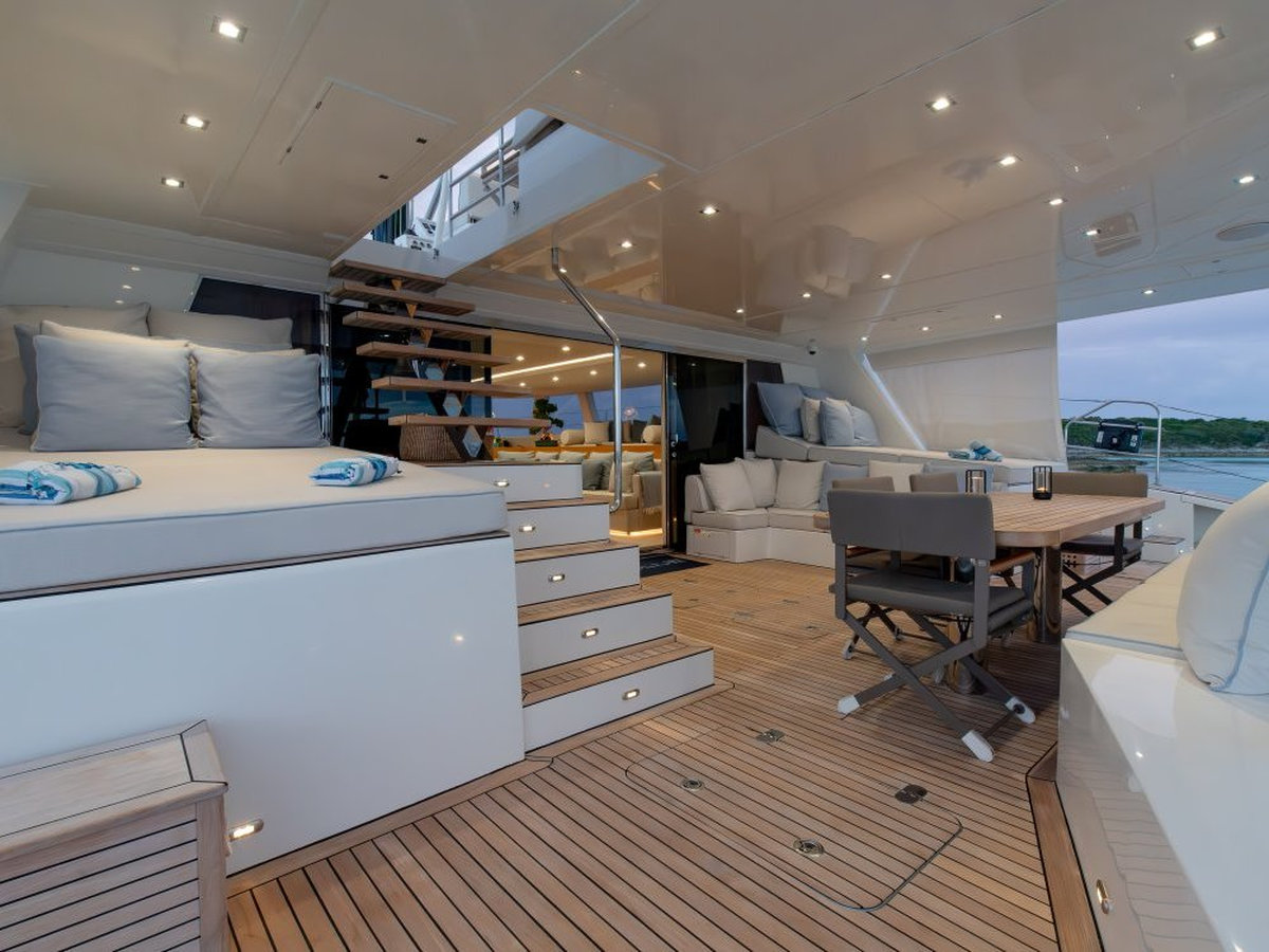 With an elegant flybridge, a hydraulic aft platform, and a forward terrace that opens directly from the saloon, she delivers expansive open-air living with sweeping ocean views.