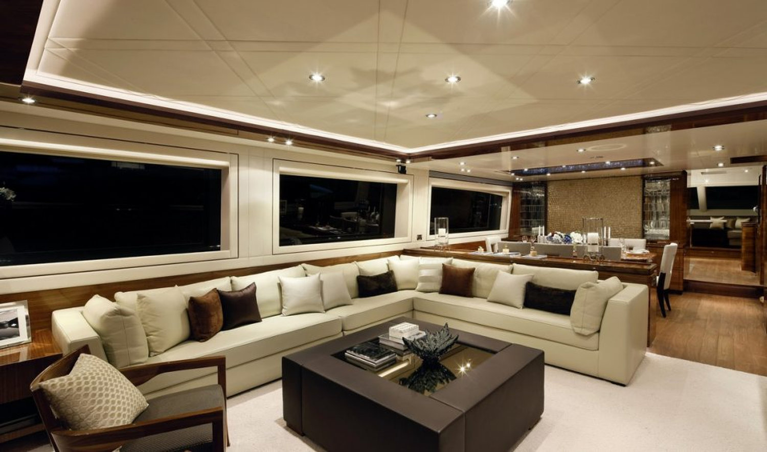 The main salon features plush seating and panoramic windows that fill the space with natural light. A formal dining area sits forward of the salon, ideal for more refined occasions.