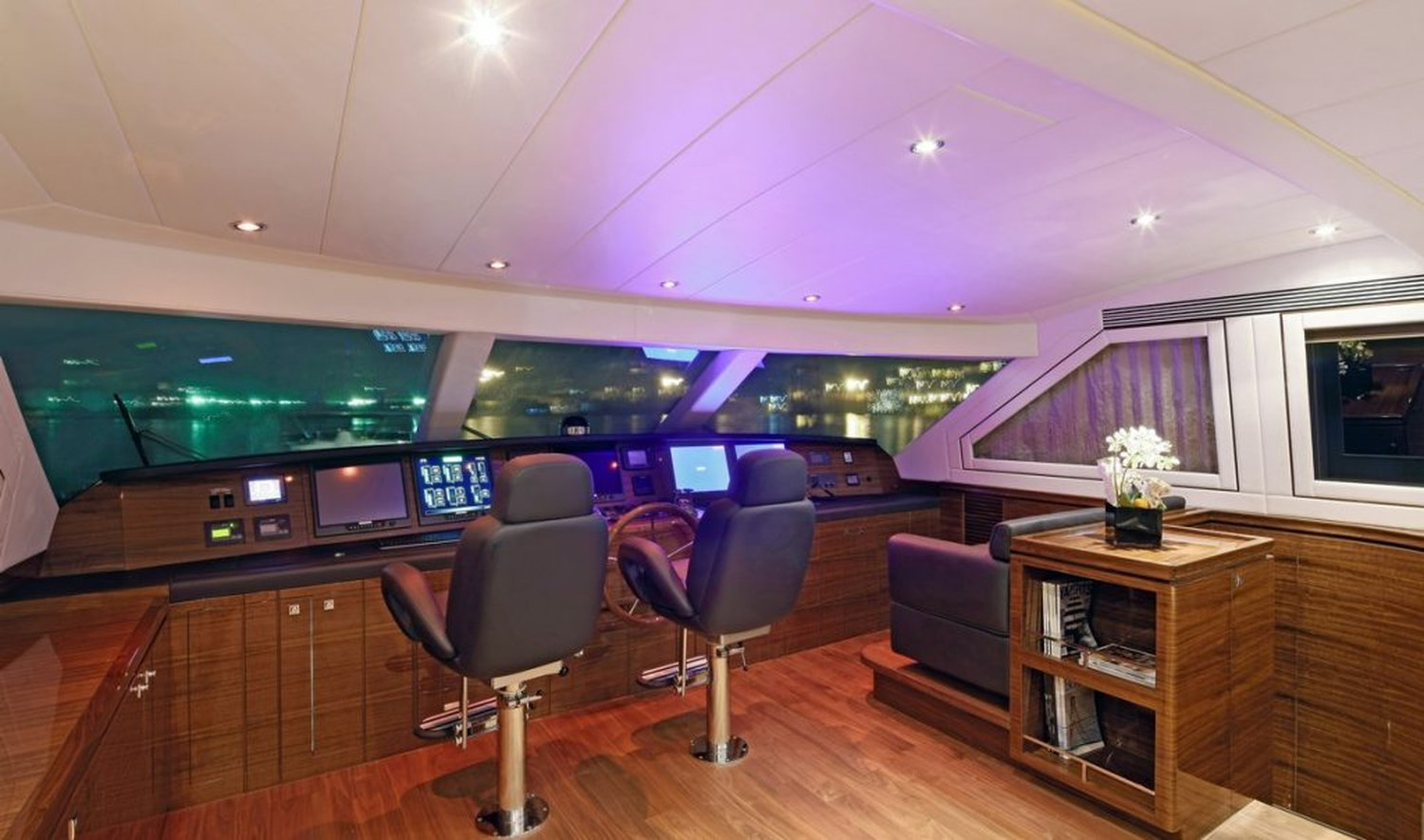 On the bridge deck, a large jacuzzi invites guests to soak in panoramic views under a wide umbrella for sun protection. Adjacent seating and lounging areas offer a perfect setting for afternoon cocktails or starlit ...