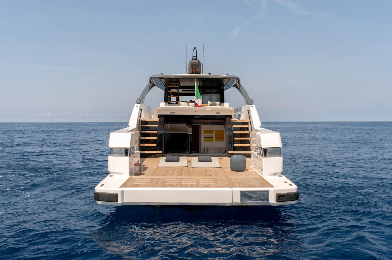 Her aft beach club-style area opens directly to the sea, ideal for relaxing or launching water toys. The sundeck and bow areas are designed for sunbathing, cocktails, or quiet viewing of the coastline—all shaded by sleek ...