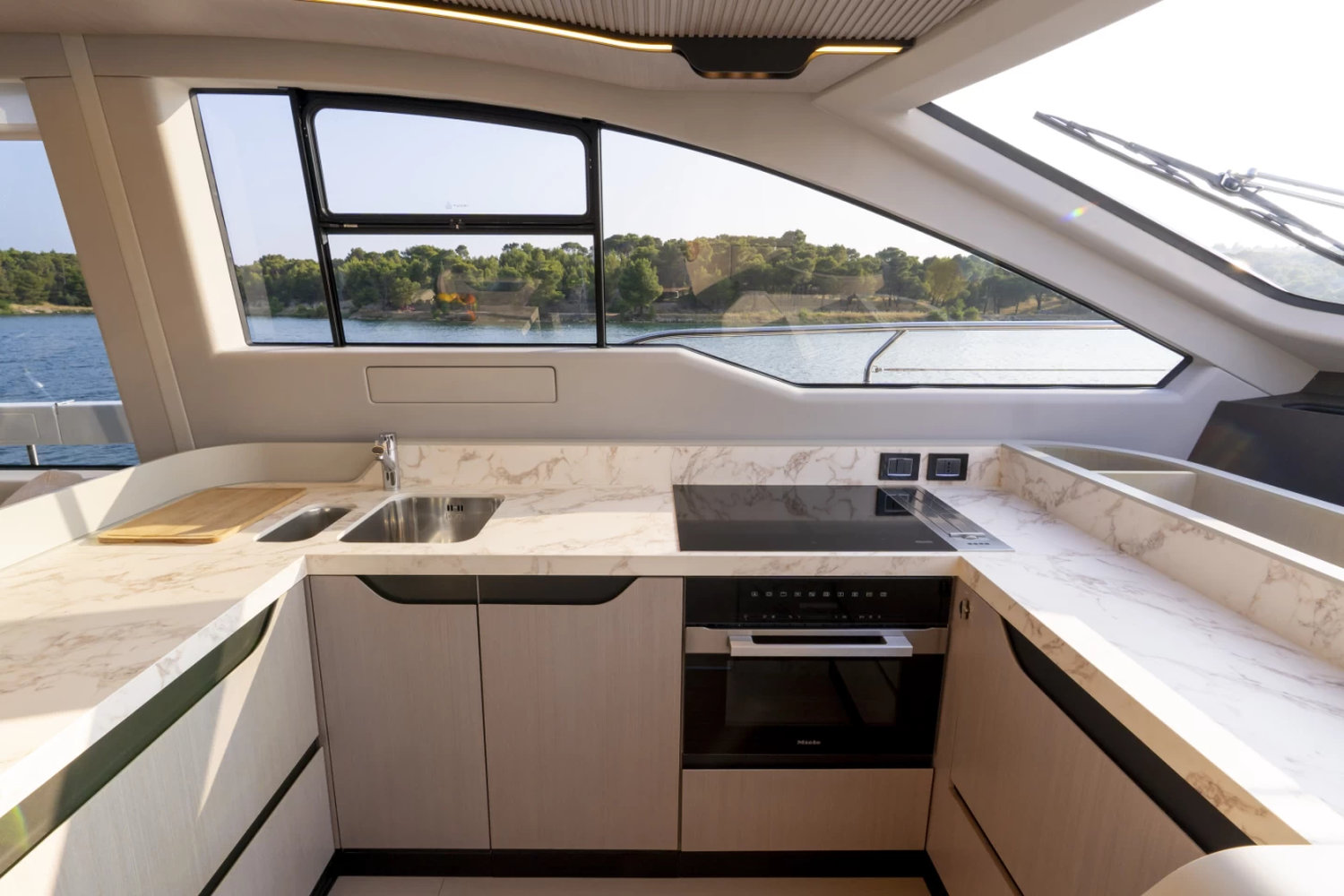 An open-plan galley and dining area forward fosters a convivial atmosphere, ideal for sharing meals with friends and family.