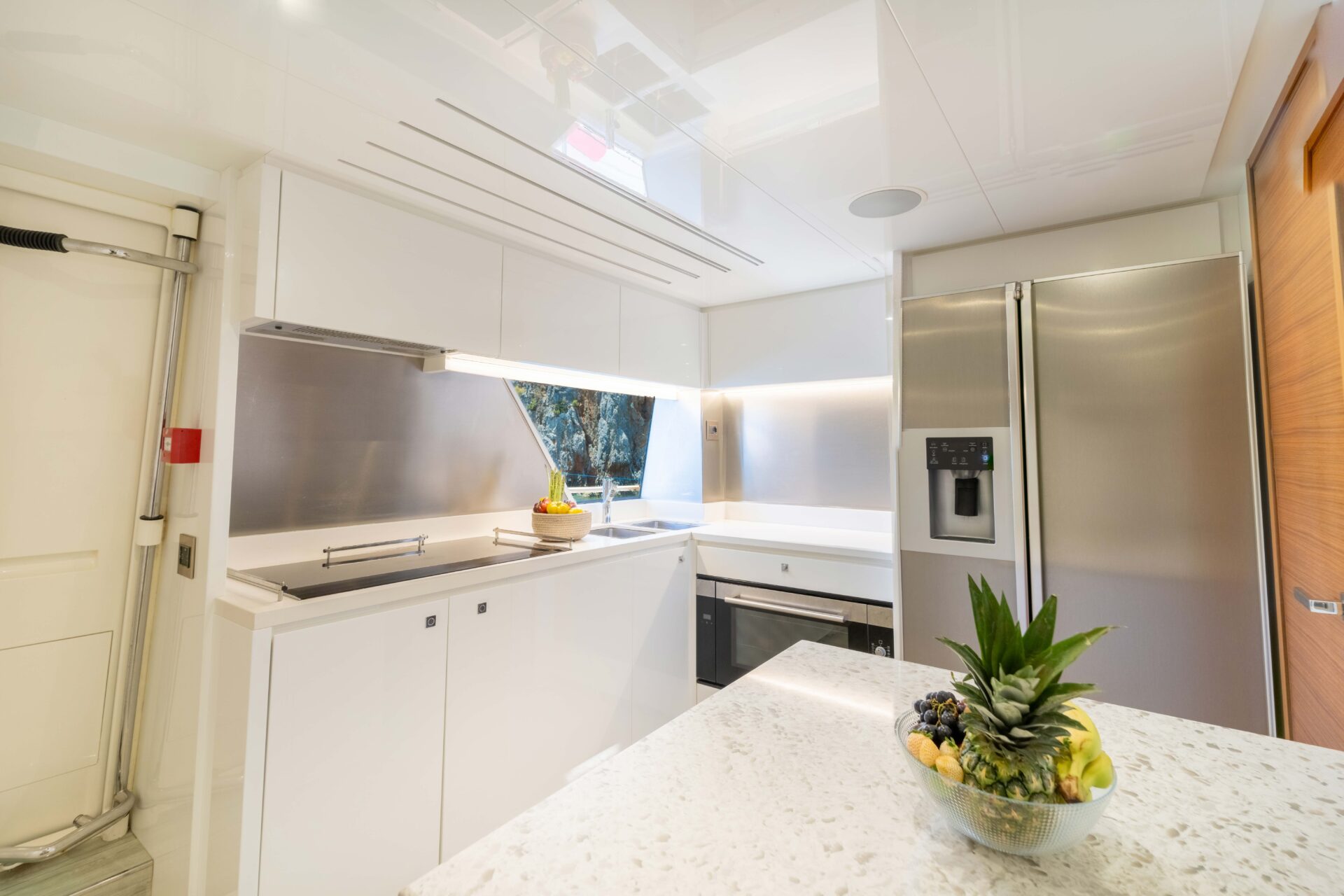 The sun deck invites long, lazy days with generous sunpads and a casual seating area, ideal for morning coffee or evening cocktails. On the upper deck aft, sliding glass doors lead to the sky lounge dining area, where fully retractable panels blur the line between indoor and outdoor.