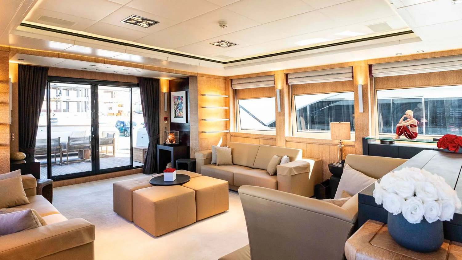 The main salon is a serene environment for lounging or entertaining, with a connected formal dining area and tasteful finishes throughout.