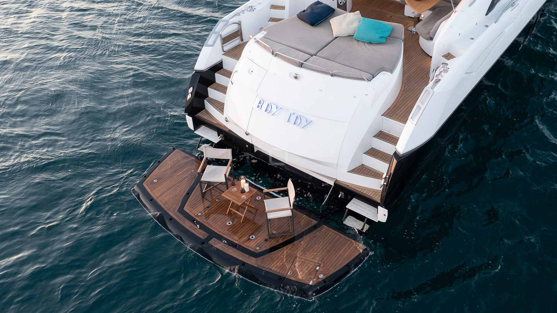Her sliding hardtop opens the main deck to the sky, creating a light and breezy atmosphere.