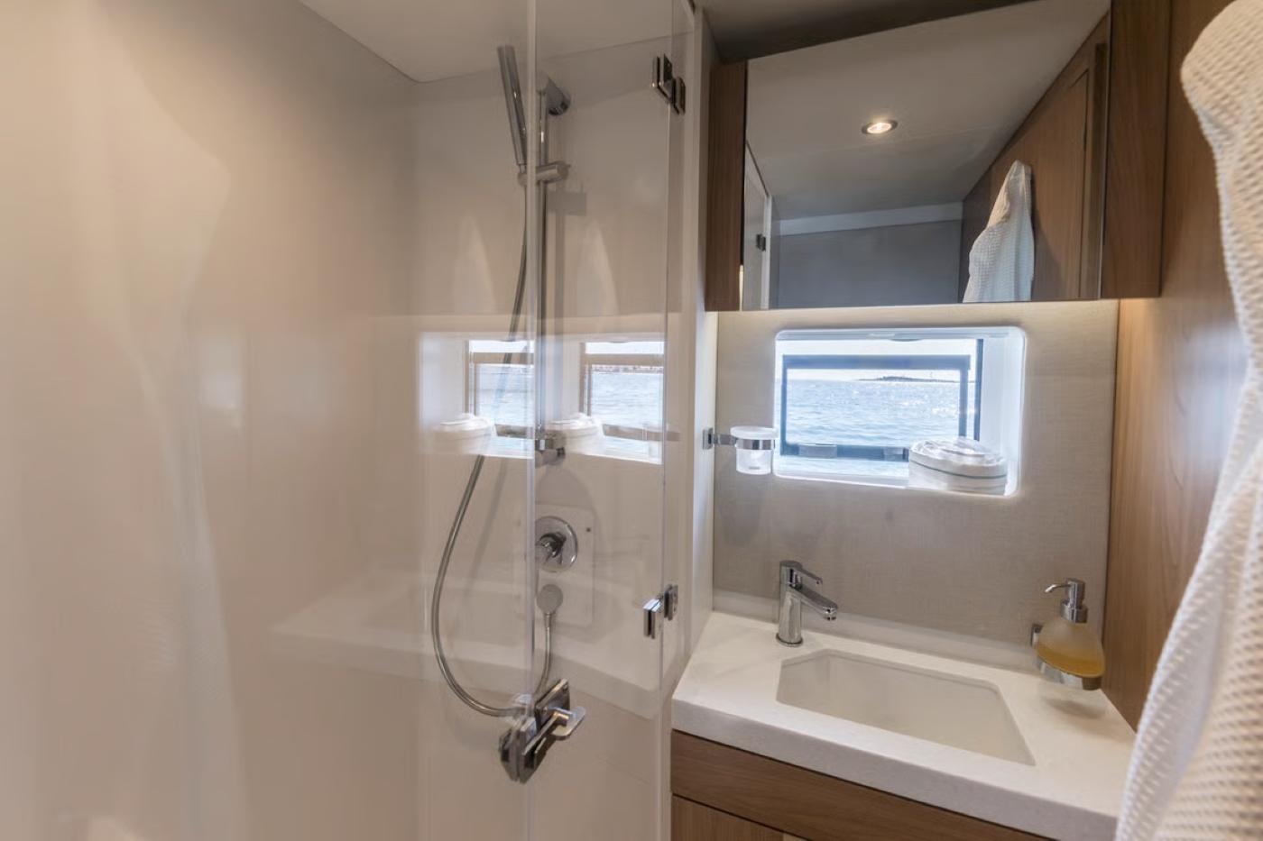 The saloon and cockpit merge without steps, ensuring effortless transitions between cooking, dining and camaraderie.