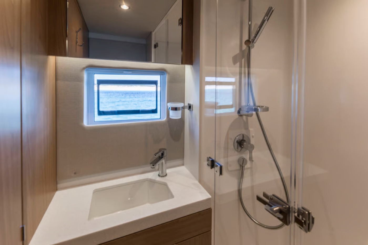 The saloon and cockpit merge without steps, ensuring effortless transitions between cooking, dining and camaraderie.