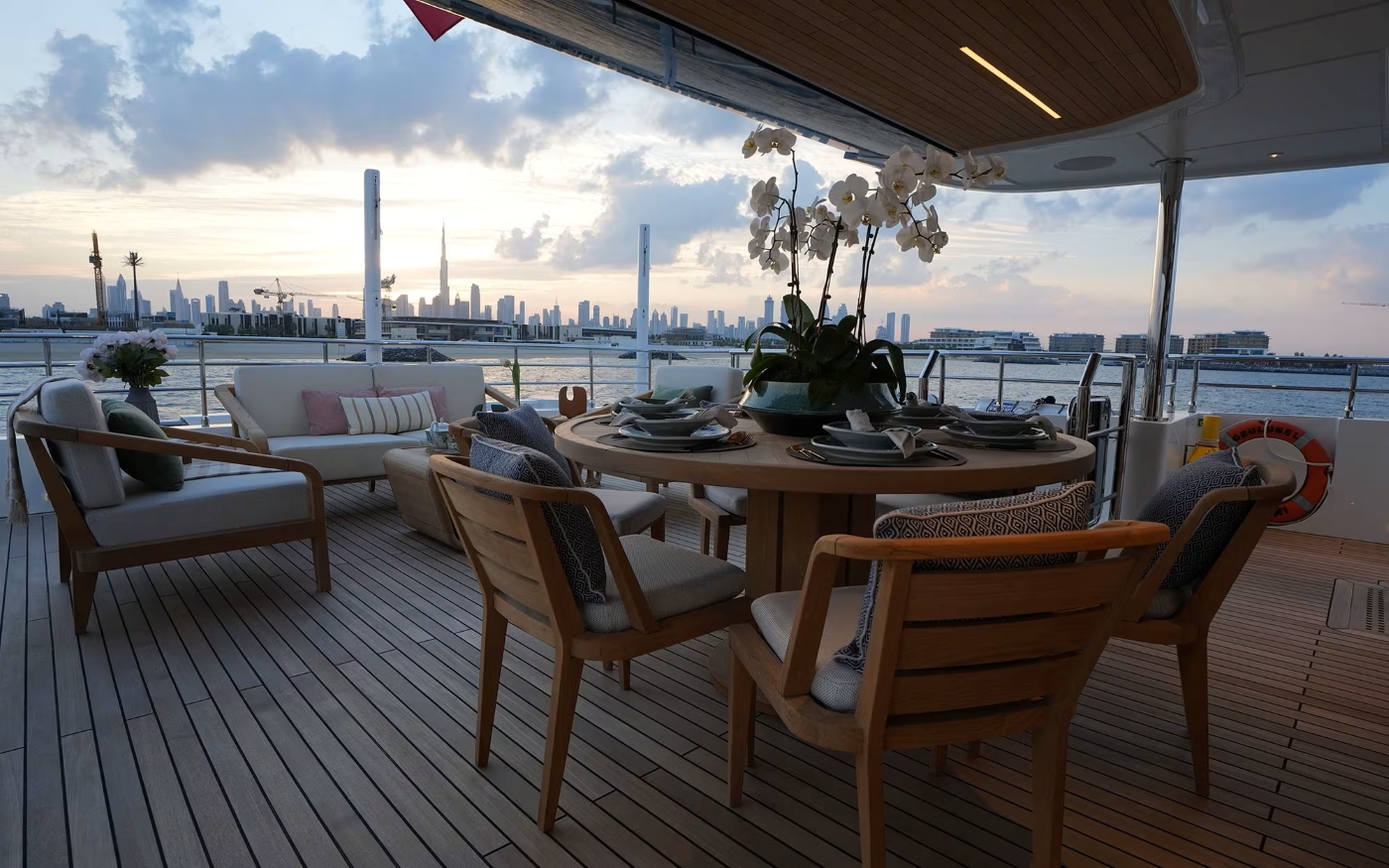 Descending one level, the upper aft deck reveals an intimate dining area beneath the overhang, complete with barbecue facilities and direct access to the saloon—ensuring effortless flow between indoor and outdoor spaces.