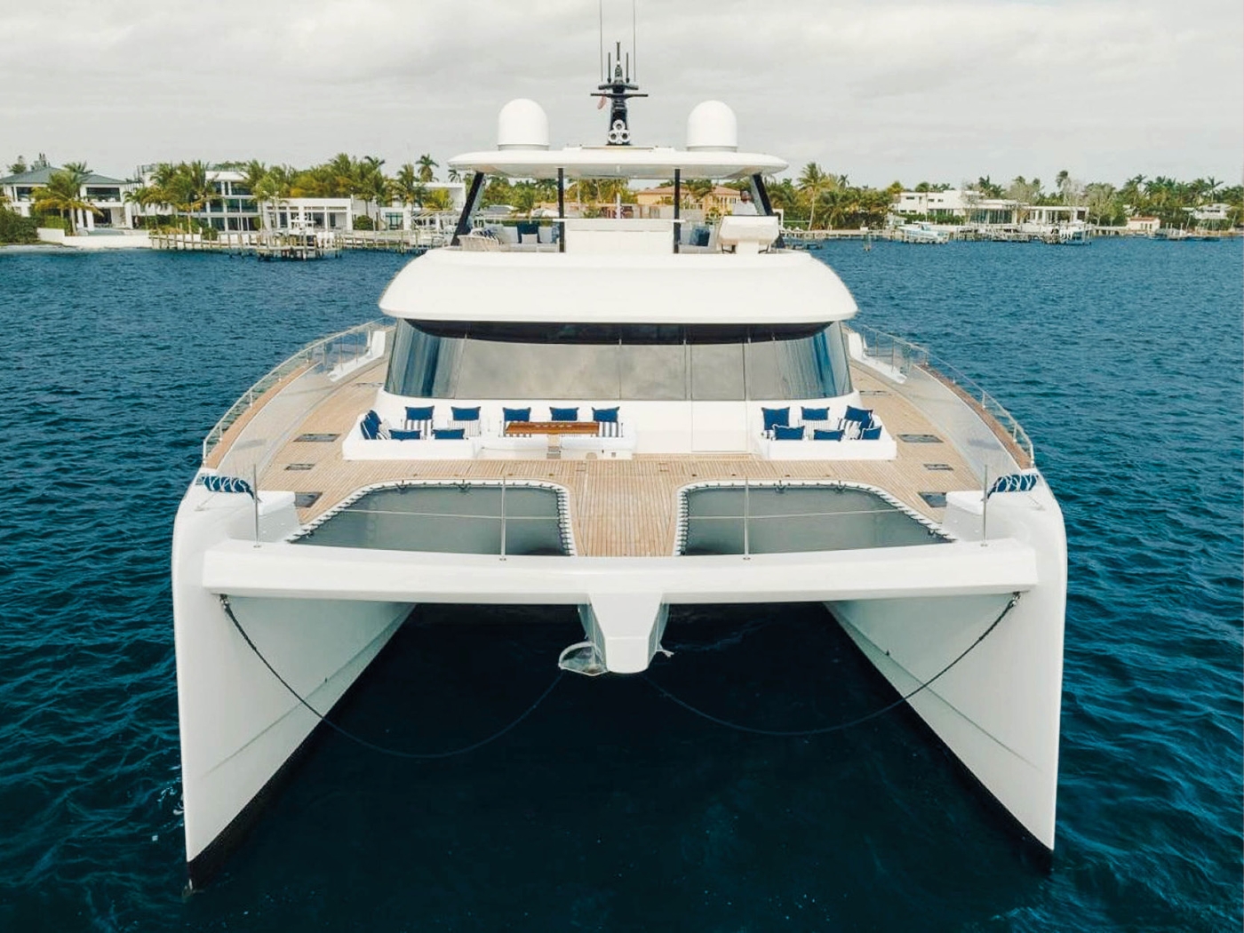 The open-plan layout connects the salon to the aft deck, creating seamless indoor-outdoor living.