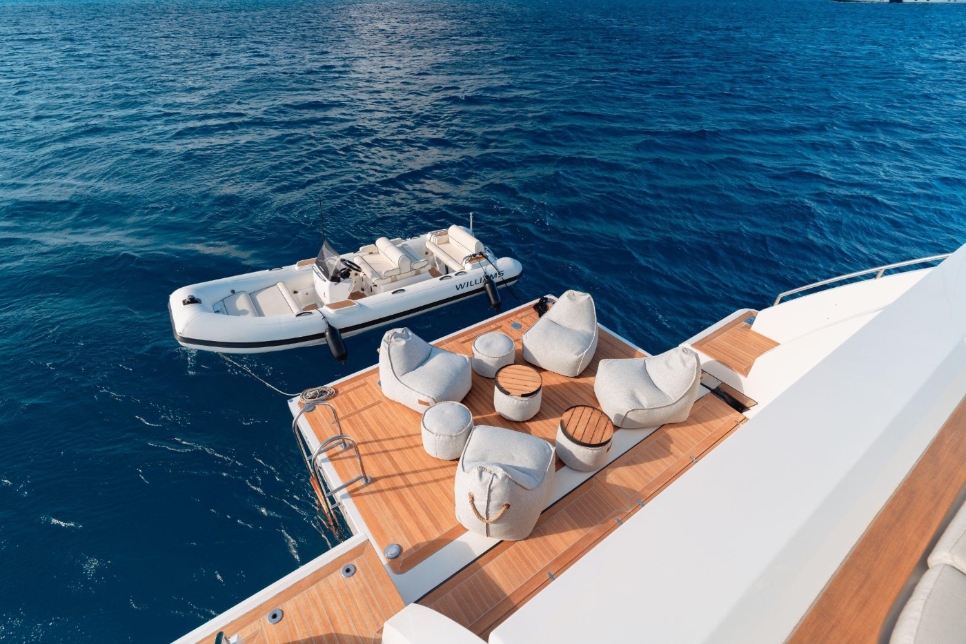 The beach club and swim platform connect seamlessly to the sea, offering a luxurious space for launching water toys or simply lounging at water level.