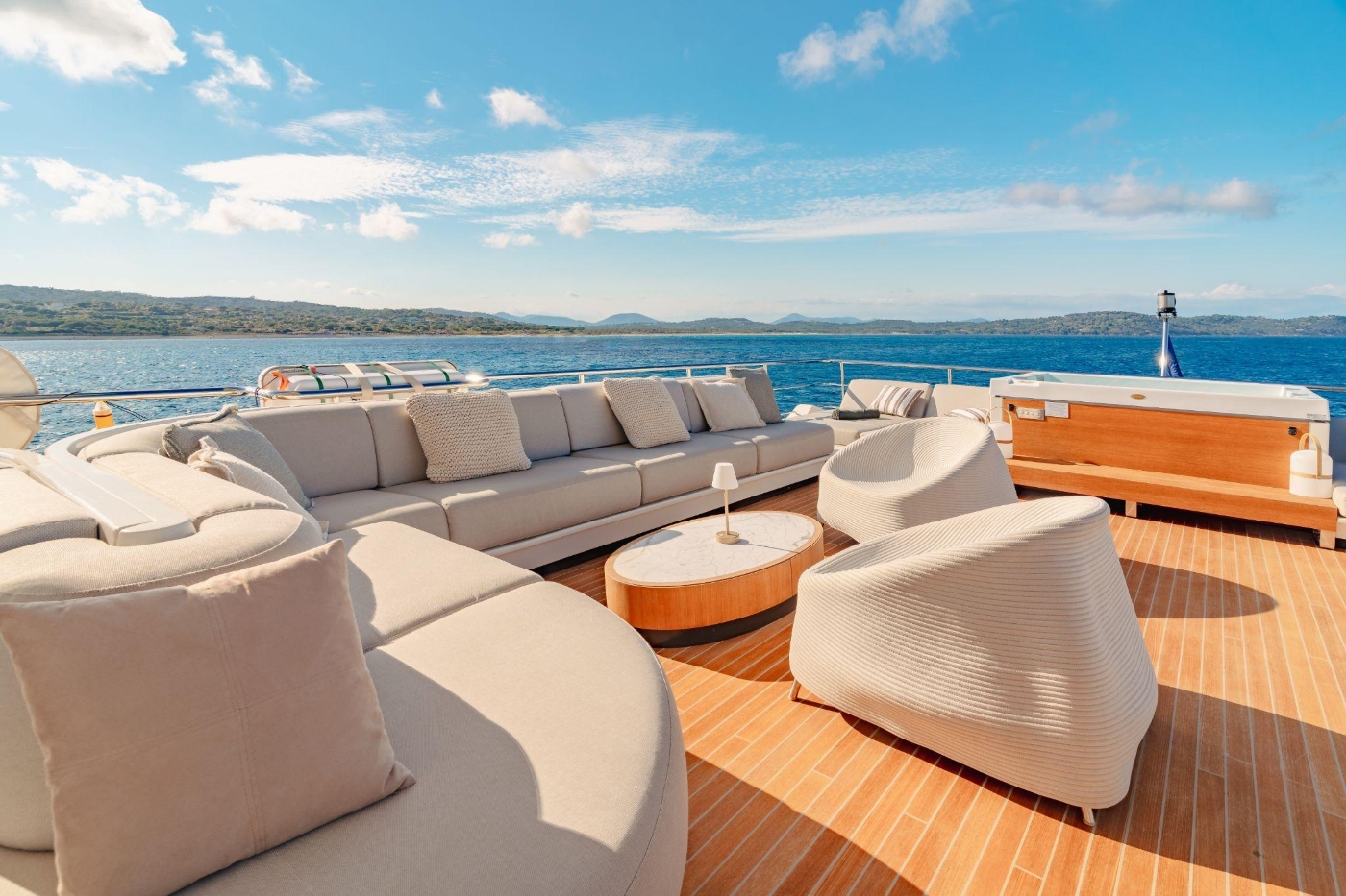 The yacht’s open decks and beach club atmosphere are complemented by a chic, light-filled interior, while a professional crew of six – including a skilled chef – ensures seamless service throughout every journey