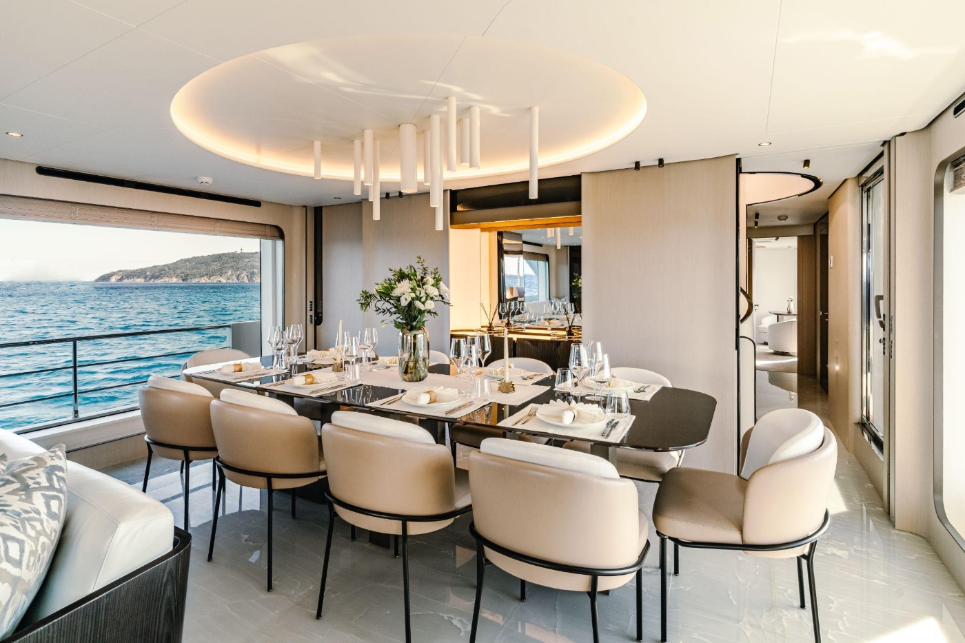 The yacht’s open decks and beach club atmosphere are complemented by a chic, light-filled interior, while a professional crew of six – including a skilled chef – ensures seamless service throughout every journey