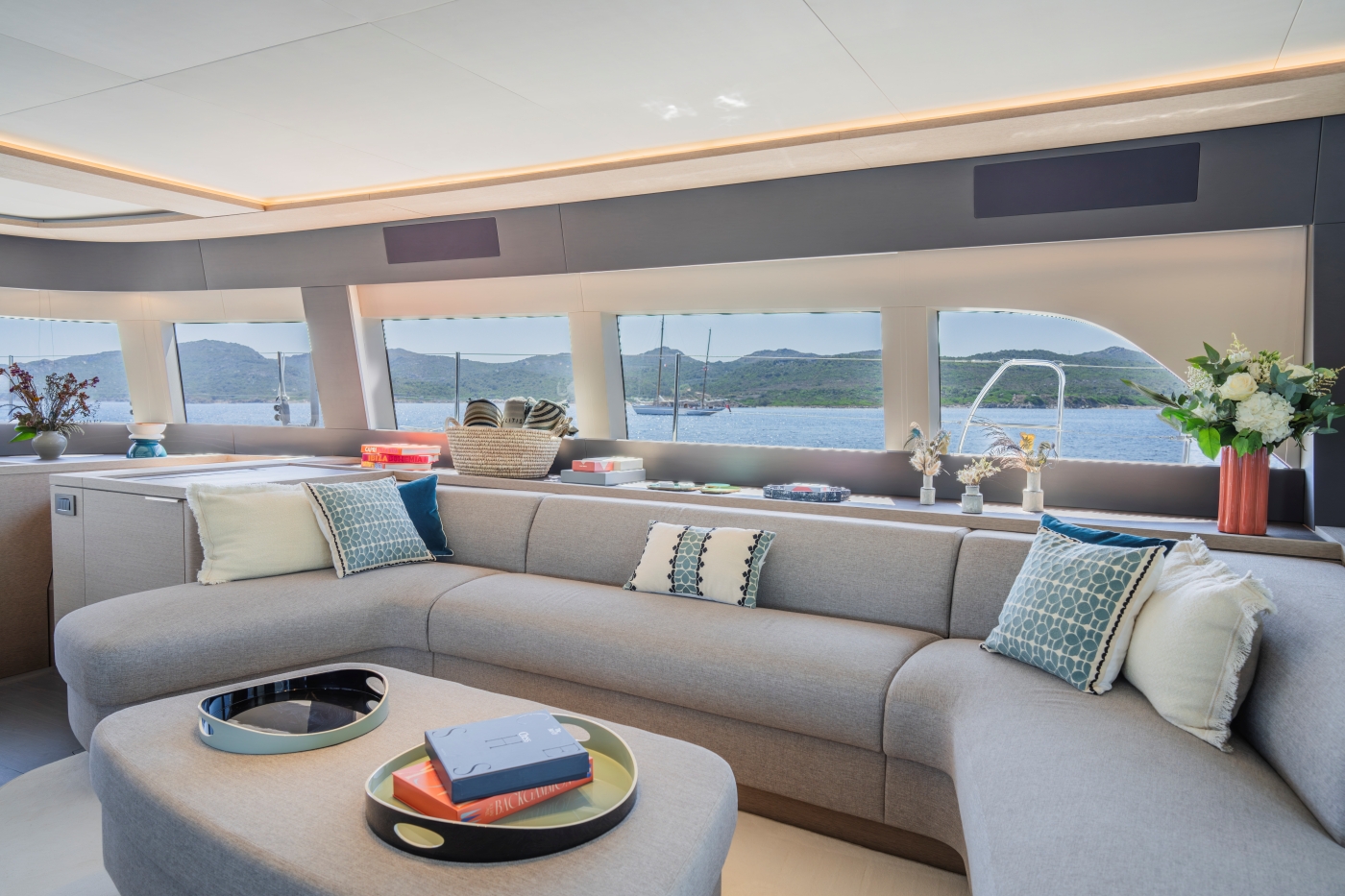 Vast forward trampolines invite guests to soak up the sun against a backdrop of azure Mediterranean waters. The flybridge offers panoramic vantage points for lounging or dining under open skies. The saloon flows seamlessly to shaded exterior areas—ideal for morning coffee or twilight aperitifs.