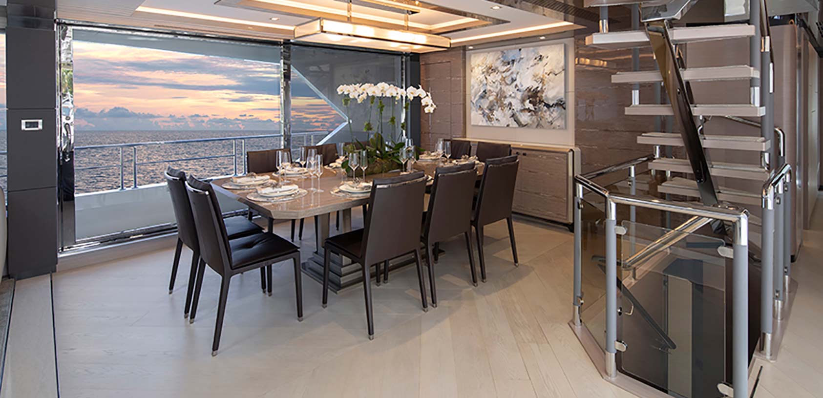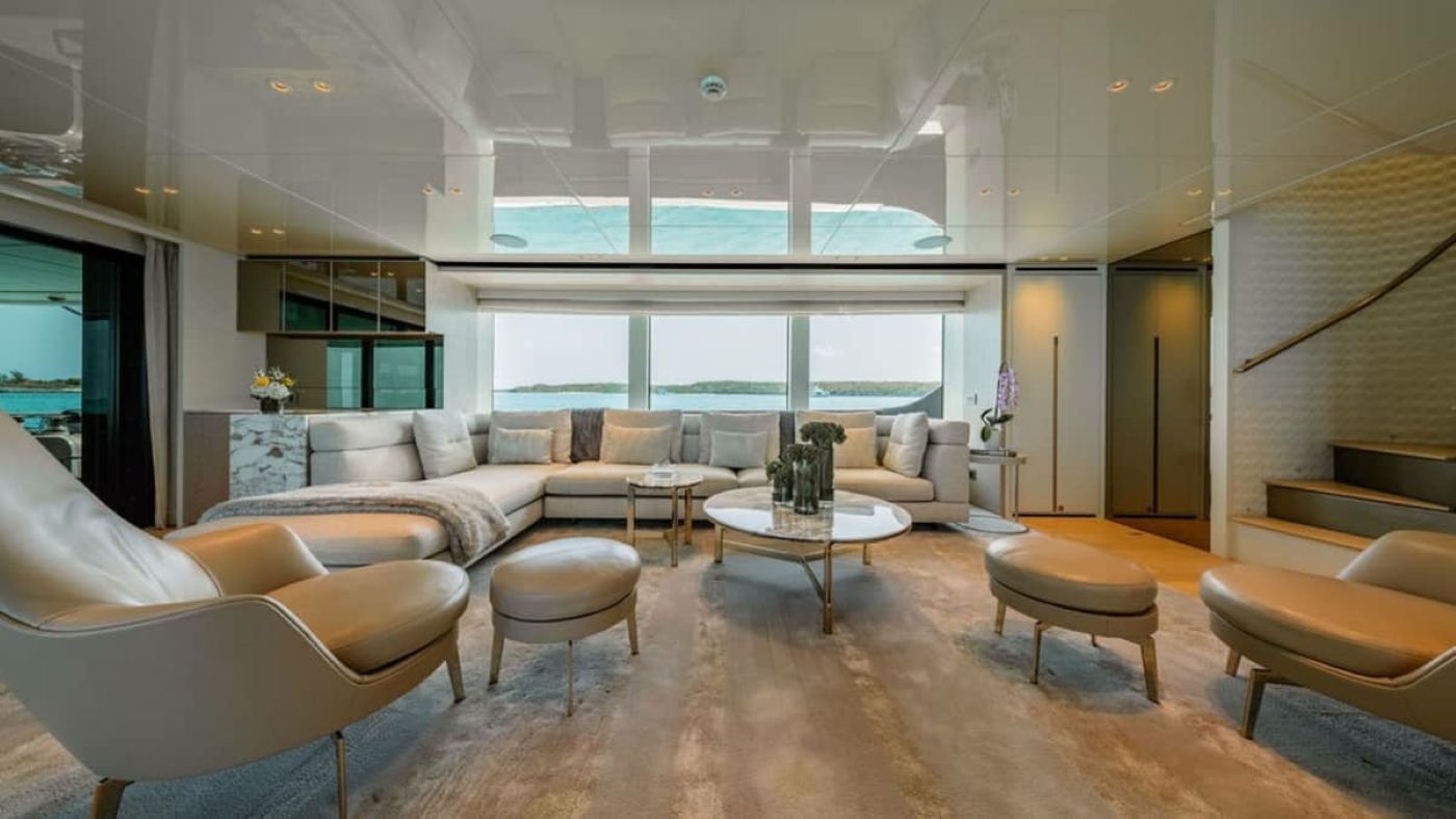 The main salon is arranged with sleek, low-profile furnishings, offering both a lounge and entertainment area, while the formal dining is located in the light-filled sky lounge for elevated experiences with panoramic ...