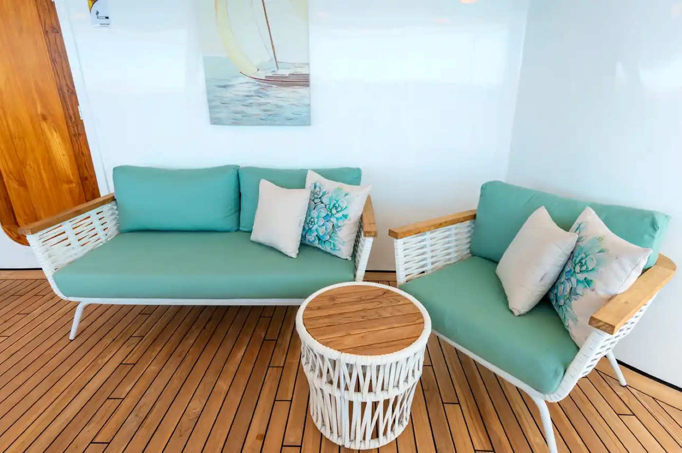 Her main deck features a spacious lounge and inviting dining salon overlooking the sea, extending to shaded al fresco dining on the upper deck, complete with a fully equipped bar – perfect for sipping cocktails amid tropical ...