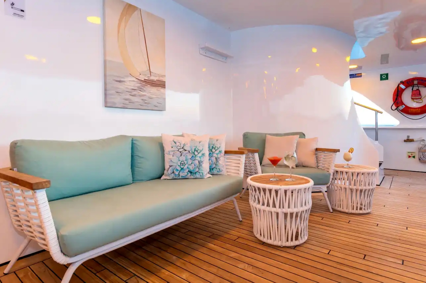Her main deck features a spacious lounge and inviting dining salon overlooking the sea, extending to shaded al fresco dining on the upper deck, complete with a fully equipped bar – perfect for sipping cocktails amid tropical ...