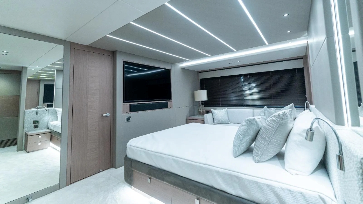 The wheelhouse is seamlessly integrated into the open-plan space, with helm chairs set forward of the lounging area for a fluid, sociable layout.