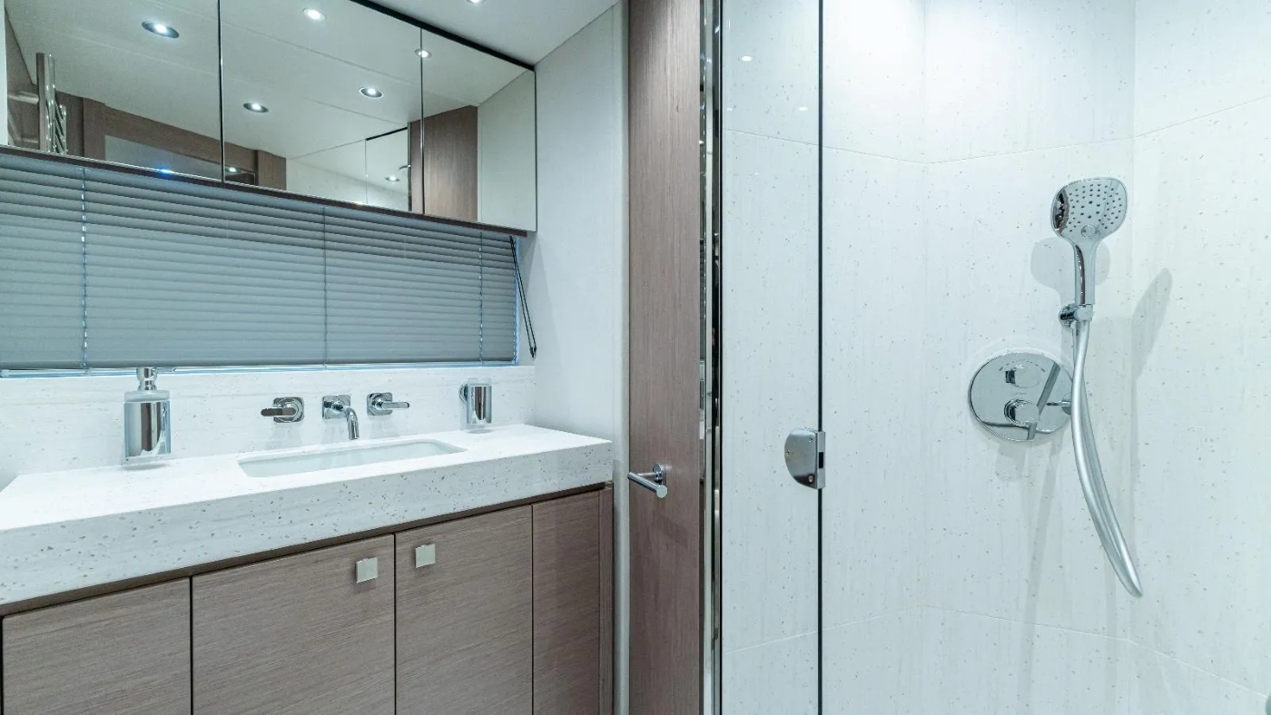 The wheelhouse is seamlessly integrated into the open-plan space, with helm chairs set forward of the lounging area for a fluid, sociable layout.